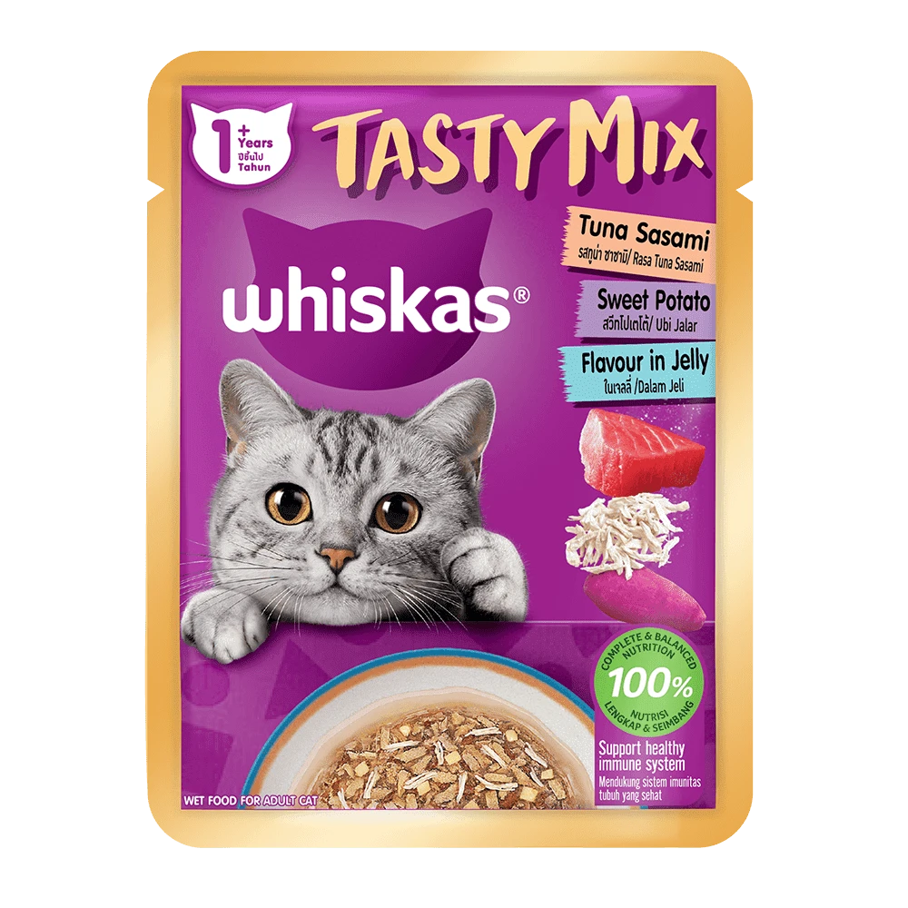 پوچ گربه ویسکاس مدل "Whiskas Tasty Mix" با طعم ماهی تن و سیب زمینی در ژله وزن 85 گرم