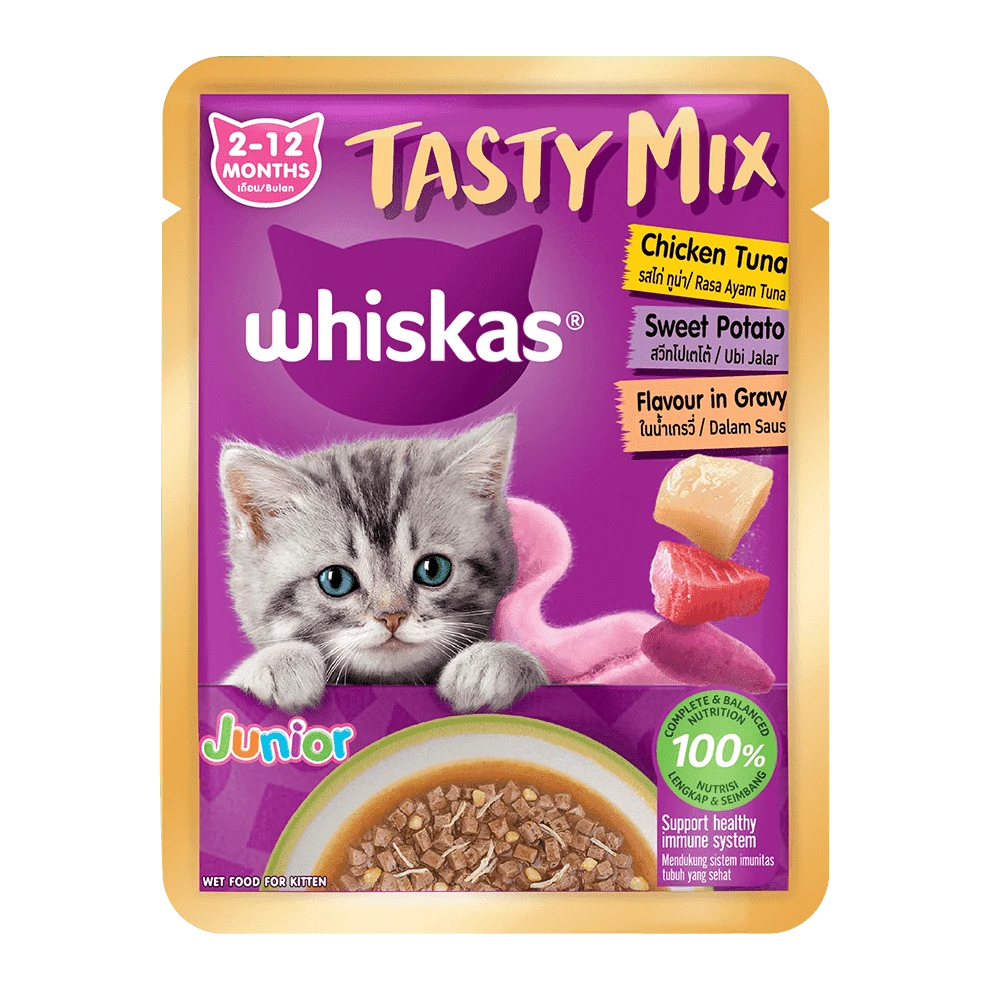پوچ بچه گربه ویسکاس مدل "Tasty Mix Junior" با طعم مرغ، ماهی تن و سیب زمینی در سس وزن 85 گرمناموجود