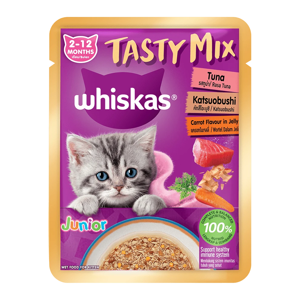 پوچ بچه گربه ویسکاس مدل "Tasty Mix Junior" با طعم ماهی تن و پرک تن و هویج در سس ژله ای وزن 85 گرمناموجود