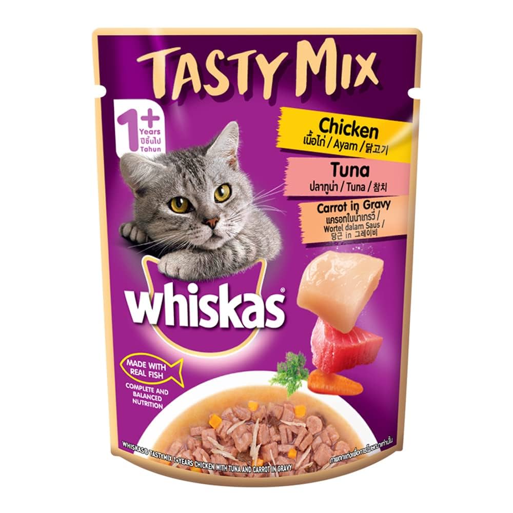 پوچ گربه ویسکاس مدل "Tasty Mix" با طعم ماهی تن، مرغ در سس هویج وزن 85 گرم